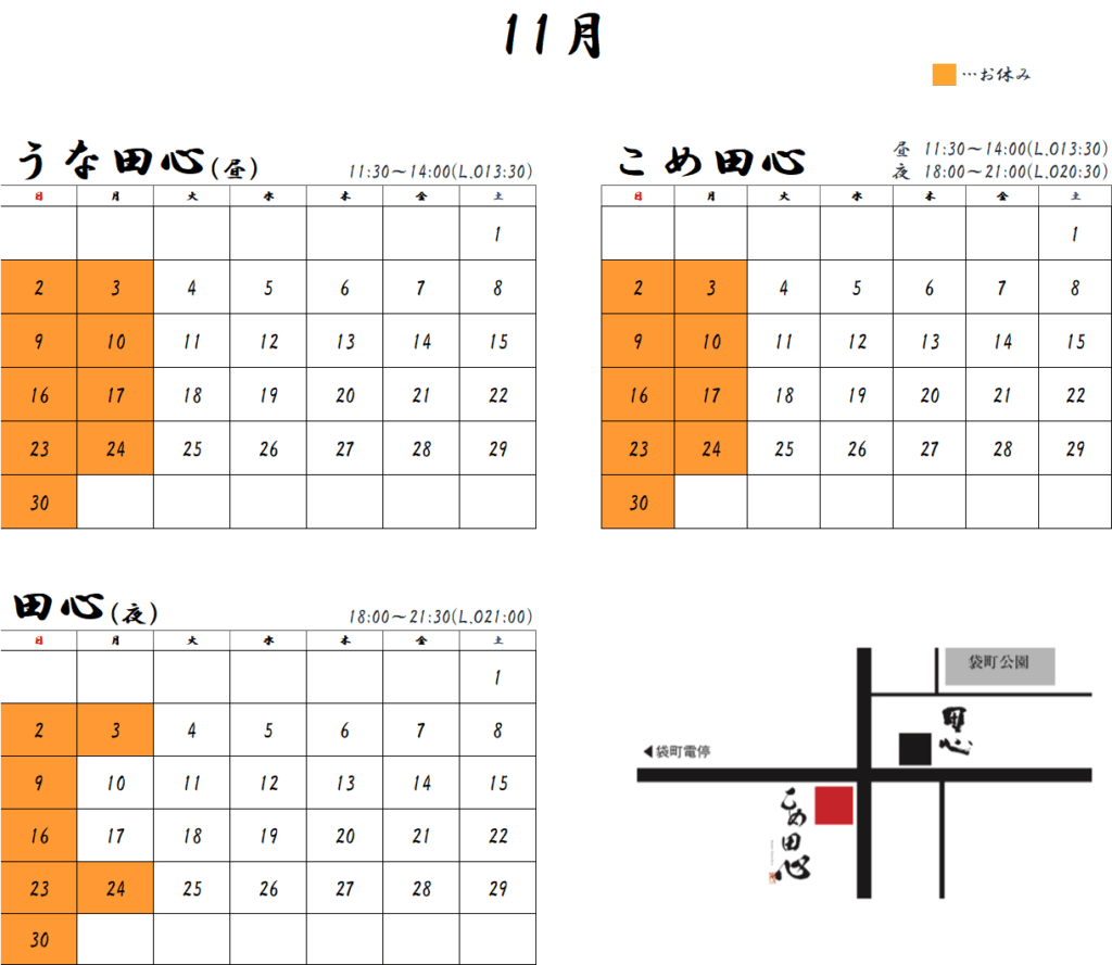 営業時間【昼営業】※昼のみ”うな田心”うなぎ定食専門